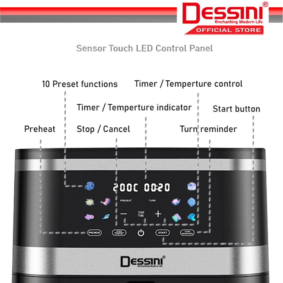 Această friteuză cu aer cald de la Dessini este un model de capacitate mare, ideal pentru familii numeroase sau pentru prepararea simultană a mai multor tipuri de alimente.
